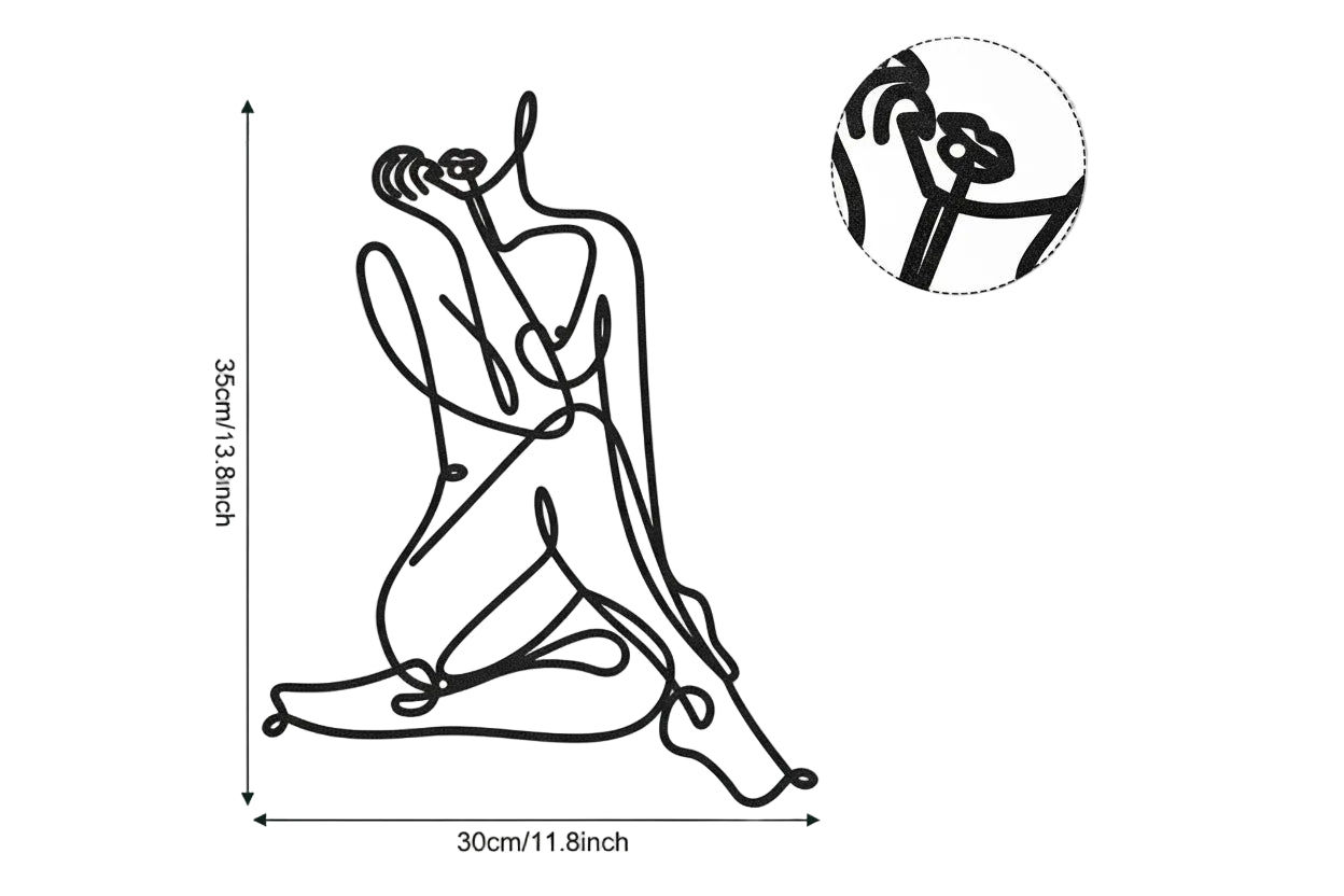 Deze minimalistische metalen wire art wanddecoratie toont een abstract silhouet van het vrouwelijke lichaam in vloeiende lijnen. Het open ontwerp geeft een lichte, artistieke uitstraling en maakt dit wandobject een subtiele blikvanger.