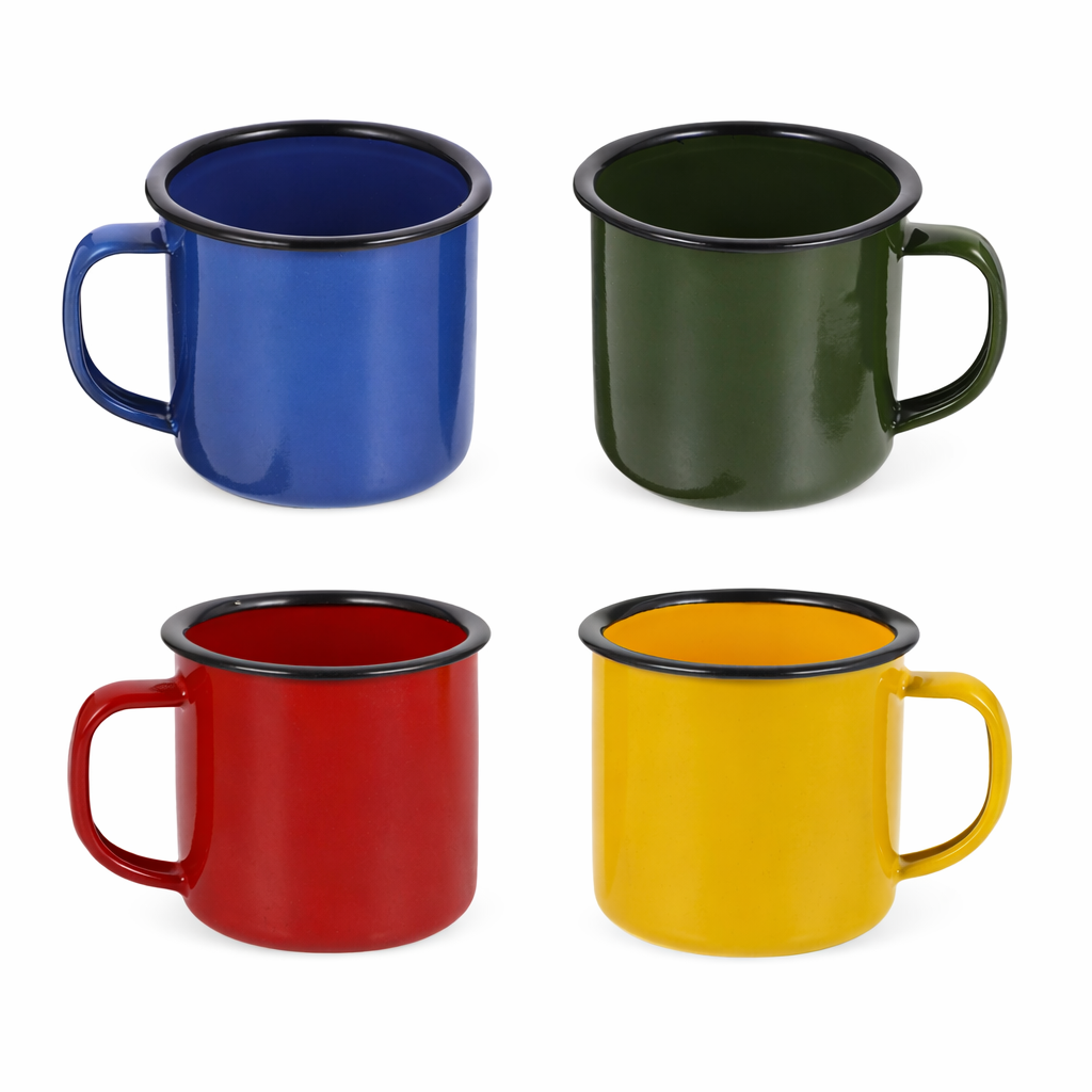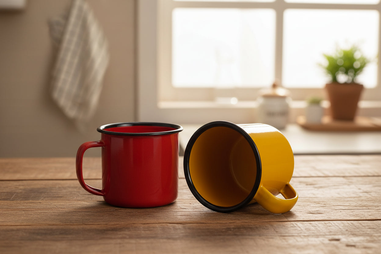 Set van 2 vintage emaille mokken met een retro uitstraling. Ideaal voor koffie, thee of andere drankjes. Stevig, lichtgewicht en perfect voor thuis, op reis of voor een gezellige bar-stijl setting.